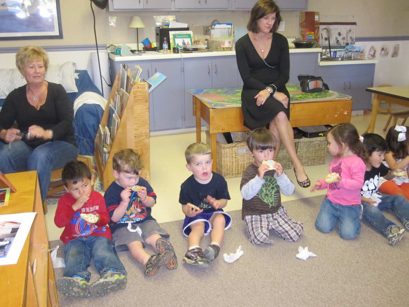 The Monday after Paige's birthday her preschool let me come in to celebrate. And, all of her grandparents were still in town so they joined me! She was so surprised. The class was out at the playground when we got there so when they came back into the classroom we were all there! We read her favorite book...Fancy Nancy...brought cookies that we made the night before and some baby pictures. I think Paige was still a little overwhelmed from the weekend because she doesn't look to excited in these pictures!